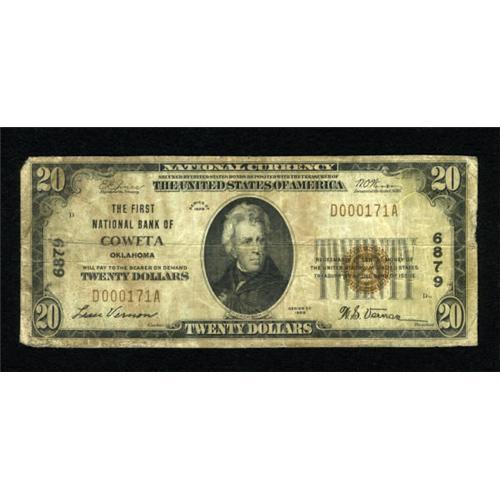 <B>Coweta, OK</B></I> - $20 1929 Ty. 1 <B>The First NB</B></I> Ch. # 6879<BR> Though toned and a little rough around the edges, the wear and fold are commensurate of a VF grade. <B>Fine</B></I>.<BR><I>From The Rolling Plains Collection</B></I><BR><BR><b>Shipping:</b> Coins & Currency (<a target="_blank" href="http://www.heritageauctions.com/common/shipping.php">view shipping information</a>)