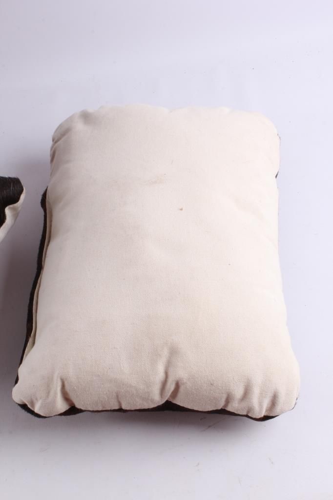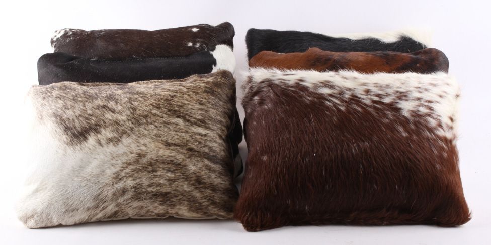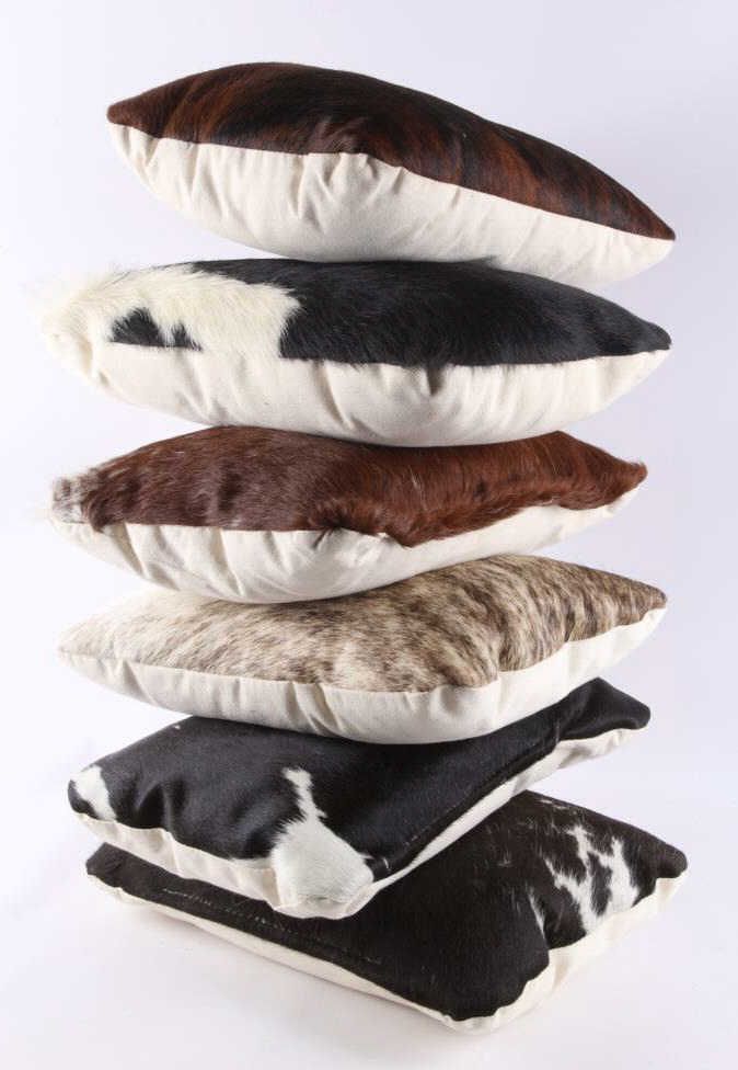 The lot features __ pillows showing different various in cowhide coloring with all having a canvas backing. These are all in good condition with some use showing and make great decor pieces. Each measures 16"x12"