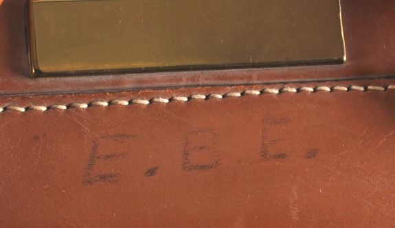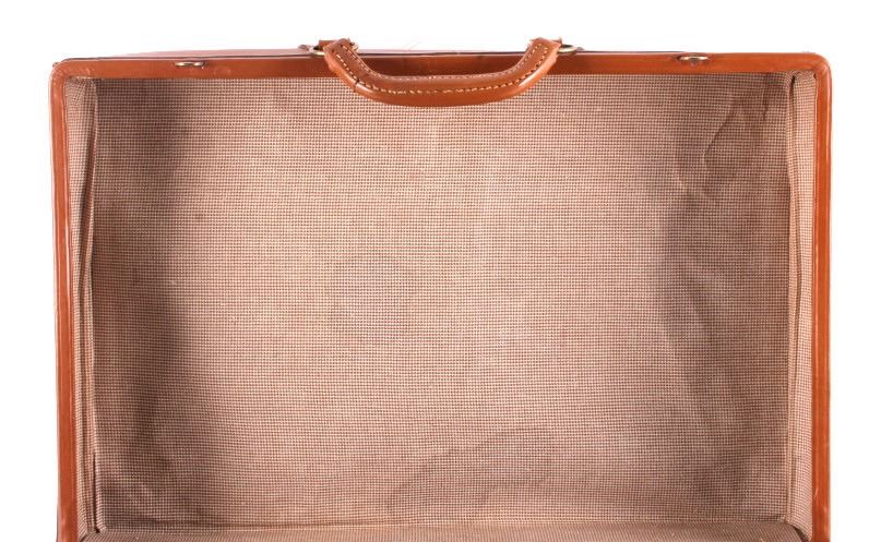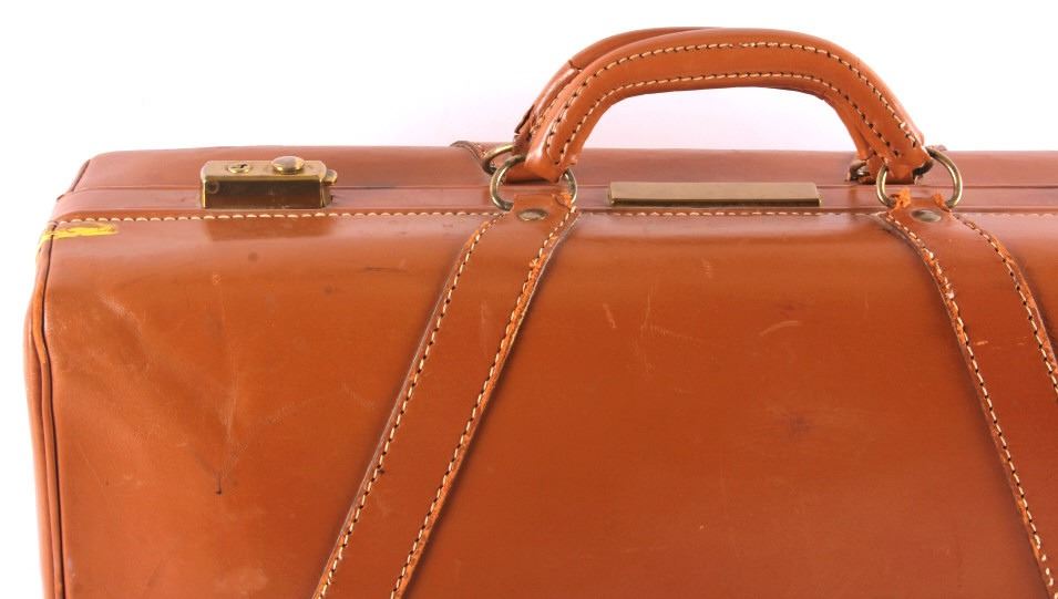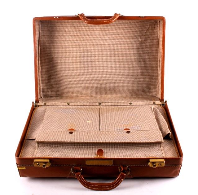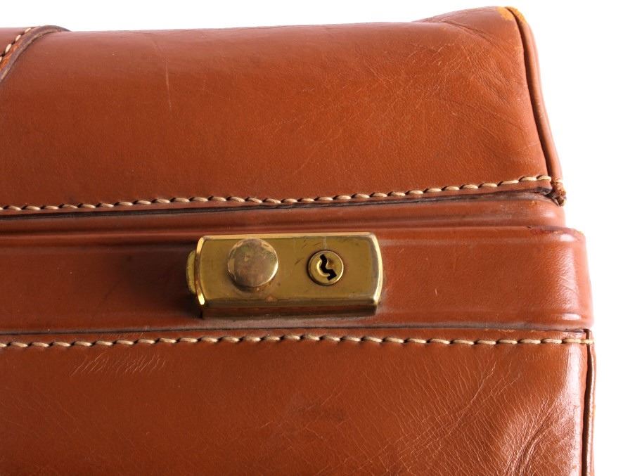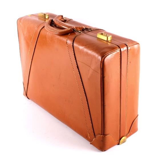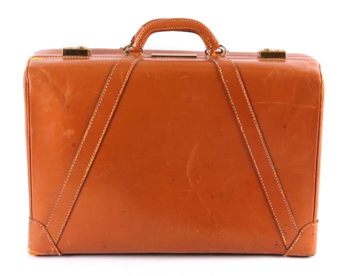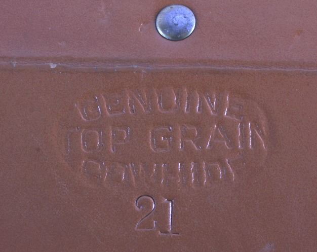 This is a cowhide leather suitcase. The suitcase is marked "Genuine Top Grain Cowhide 21" and shows good overall condition. The suitcase measures 7" x 14" x 21".