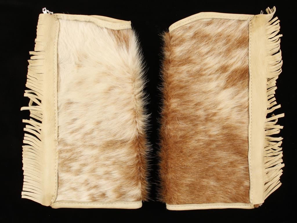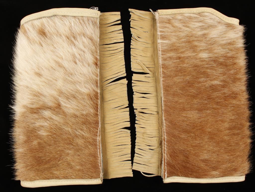Zip on type with brown leather fringe. Made by local Dewey artist.