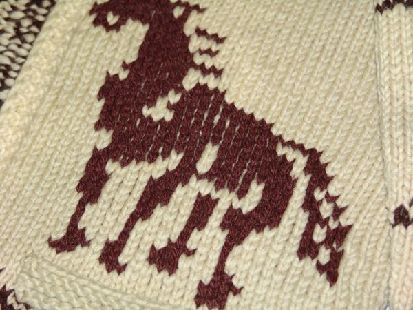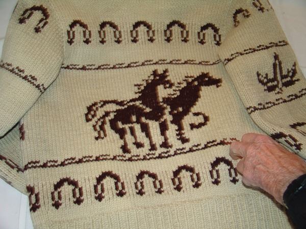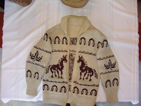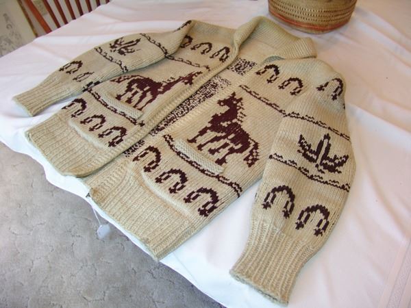 Ca.1950s Mens large Wonderful, hand woven, wind and rain resistant, home spun woolen sweater done in traditional style and with eagle, horse, and horseshoe figures. Collected on N. Vancouver Island in 1967. Very good condition. Ex. Mark Wald collection.