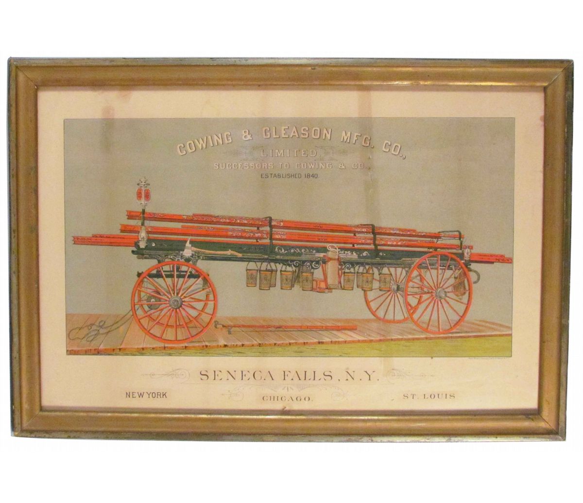 Cowing & Gleason Mfg. Co. Advertising Paper Print. Seneca Falls, New York. Detailed image of hand drawn Hook & Ladder Wagon. Vertical tears with minor staining otherwise fair condition. 17 3/4 X 11 1/2 inches.