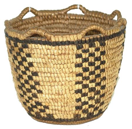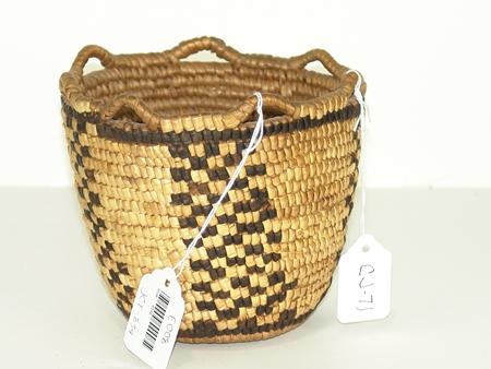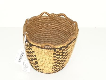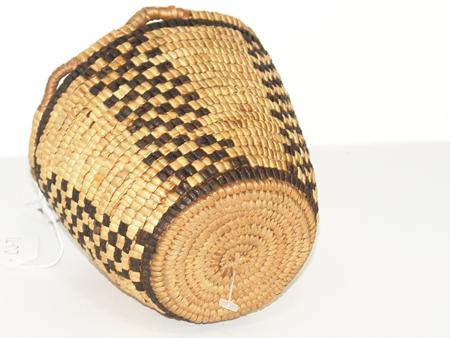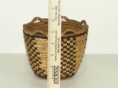 Circa Early 1900s, Small finer weave hard sided basket with columns of fully imbricated checkered designs. Very good condition. 5" x 6"