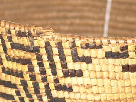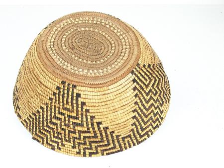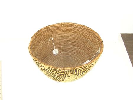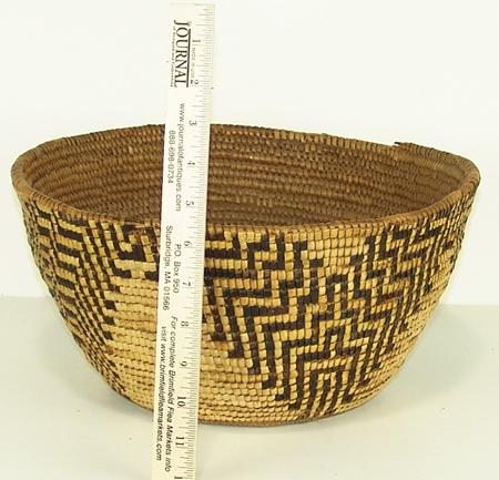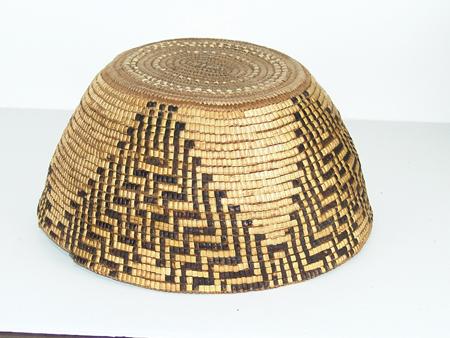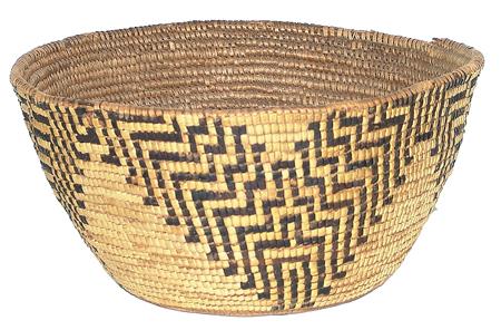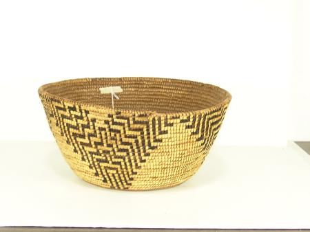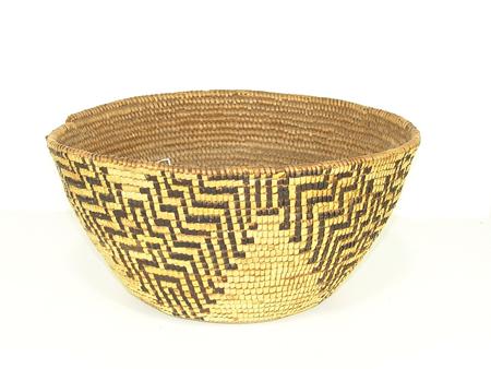 Circa Early 1900s, Outstanding hard sided basketry bowl with two-color imbricated exterior design using traditional cowlitz symbols. Very good condition, intact with some missing stitches. 6" x 14"