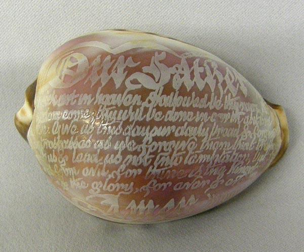 Cowrie Shell with Lord's Prayer Inscribed. Measures approx. 2.25''Hx3.5''L. Buyers Pay Actual Shipping and Handling Charges(see terms and conditions for more information).