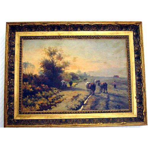 Oil painting on board. Cannot read the signature-but the painting is very well done. The measurement above is the canvas size. Framed size is 12.5 X 16. Believe it to be turn of the century and European. The frame is in very good shape but has some cracks as you can see in the close up photo. You have to look closely to see them