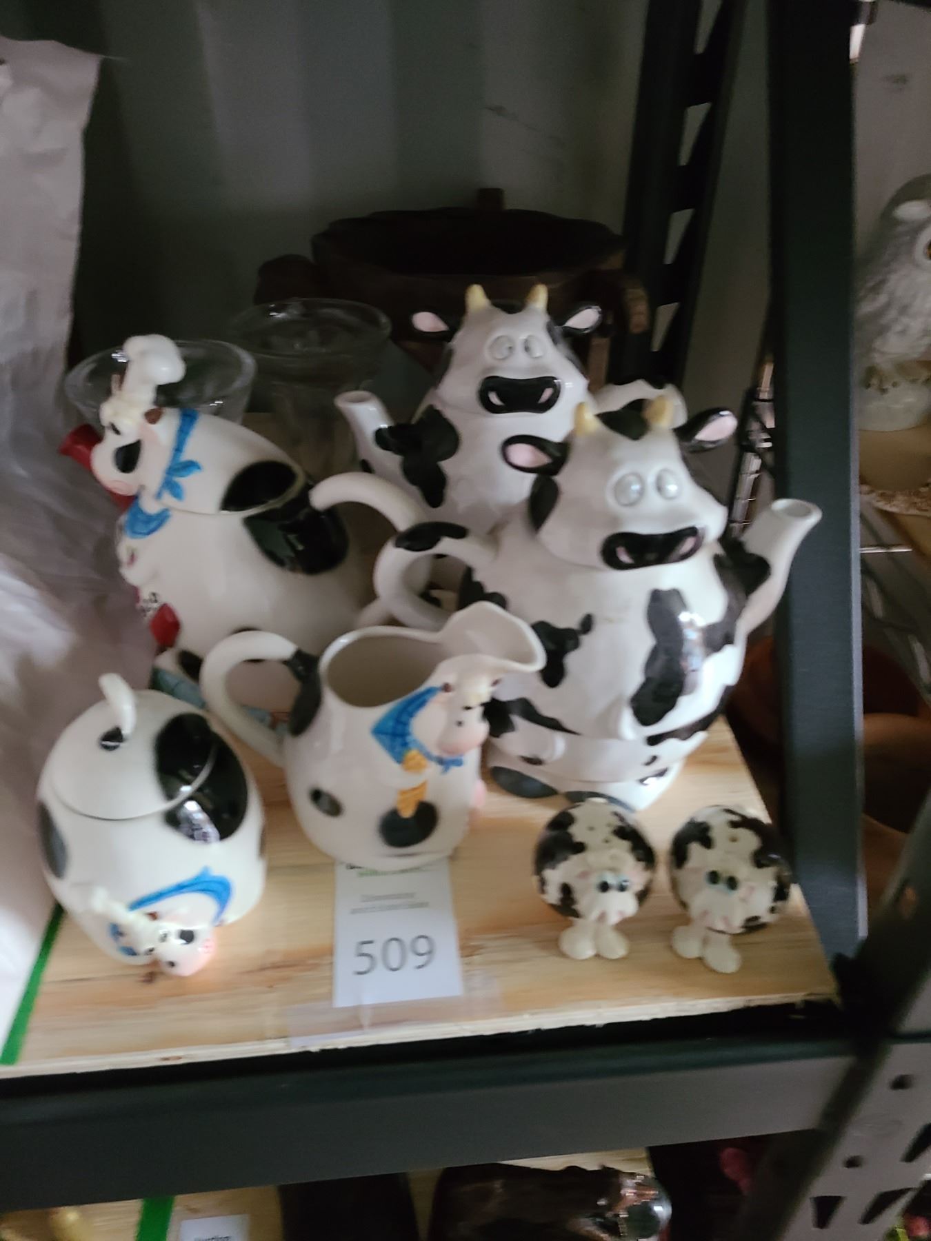 Lot includes cow teapots, sugar and creamer, wood bowl, and sundae glasses. Bring packing material. Pickup at 9 am.