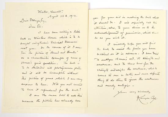 Cox, Kenyon (1856-1919) American painter, figural compositions. Two Autograph Letters Signed, total of 3½ pp, 6½ x 5 in., Windsor, Vermont, 1913 Aug. 25 and 30. Very fine. To Louis Ettlinger at the American Lithographic Company, first asking permission to have Homer Winslow's painting "Hound & Hunter" reproduced for Cox's book on Homer ("I have tried to analyze Homer's art, its strength & weakness…."), then thanking Ettlinger for having complied. Transmittal envelopes addressed in Cox's hand.