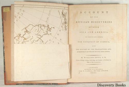 Coxe, William. ACCOUNT OF THE RUSSIAN DISCOVERIES BETWEEN ASIA AND AMERICA. TO WHICH ARE ADDED, THE CONQUEST OF SIBERIA ..... London: J. Nichols for T. Cadell 1780 First edition 4to. xxii,344,(13)pp plus ad leaf. Four folding maps, folding plate. Old half calf & marbled boards, rubbed, sm. defect in lower front board . Very small stain on one map, touch of foxing, but a very good copy