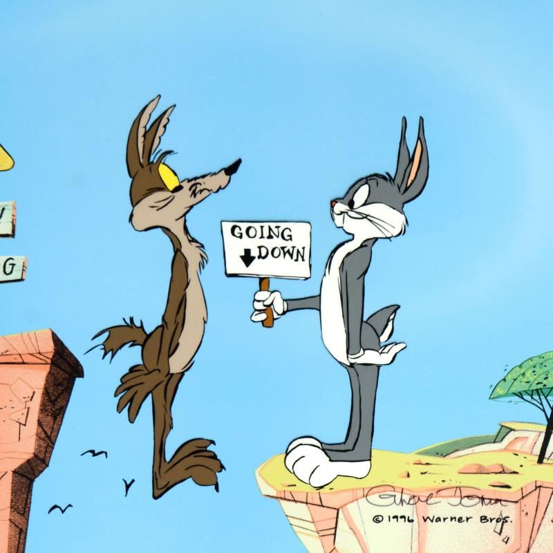 "Coyote Crossing" is a limited edition animation cel with hand painted coloring on sericel outline. The piece is numbered, hand signed by Chuck Jones (1912-2002), and includes a Certificate of Authenticity! Measures Approx: 16.5" x 13.5"
