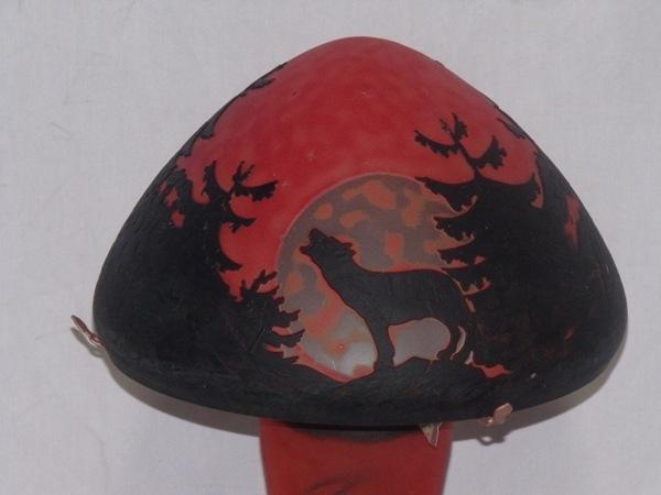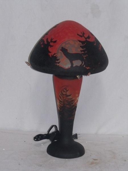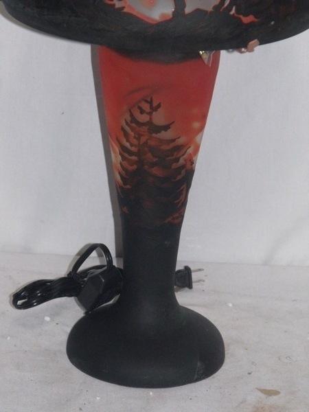 Delightful table lamp, a lone coyote howling at the moon is depicted on this lamp. 24.5" H, Shade 13.5", base 6"