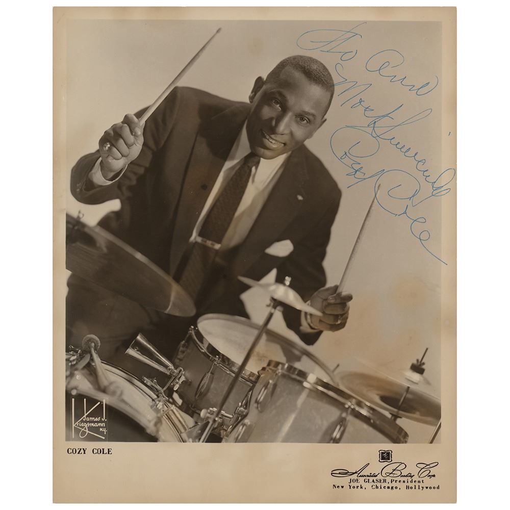 Vintage glossy 8 x 10 Associated Booking Corp. photo of Cole at his drum kit, signed and inscribed in blue ballpoint. In very good to fine condition, with some light staining and small surface impressions.