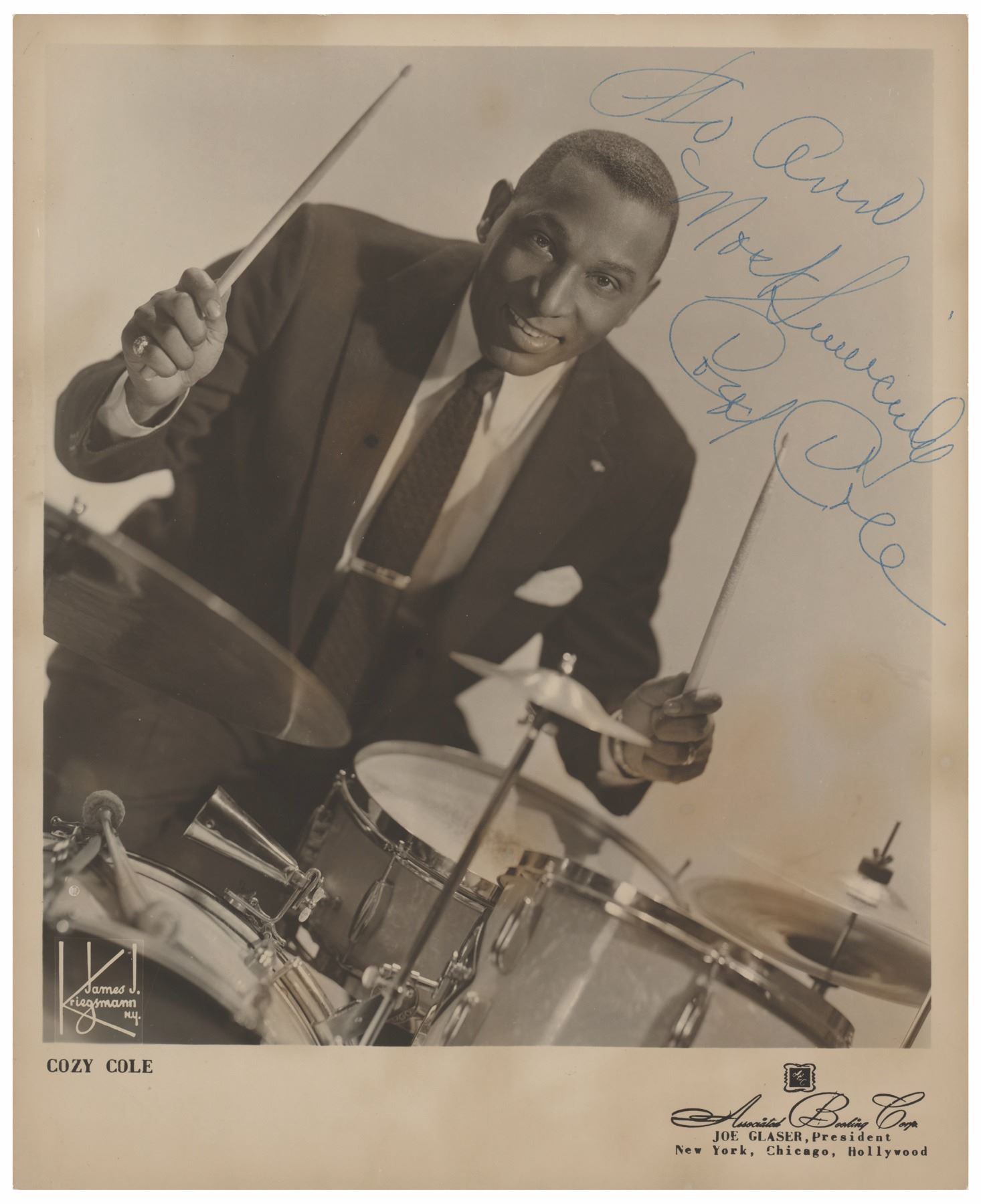 Vintage glossy 8 x 10 Associated Booking Corp. photo of Cole at his drum kit, signed and inscribed in blue ballpoint. In very good to fine condition, with some light staining and small surface impressions.
