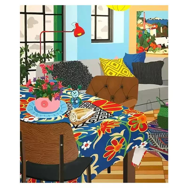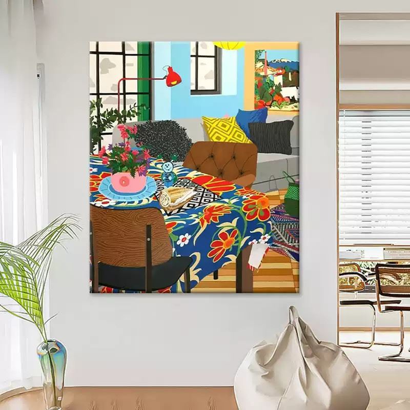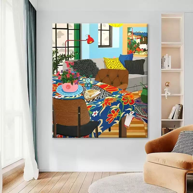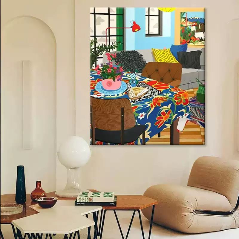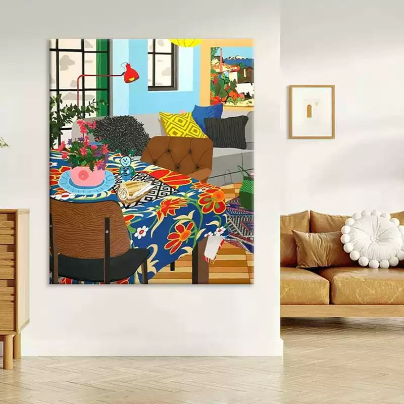 This vibrant interior scene captures the warmth and liveliness of a well-lived space. The bold, floral-patterned tablecloth is the centerpiece, surrounded by carefully arranged décor items that add personality and charm. The playful combination of bright cushions, colorful plants, and artwork on the walls creates a cheerful atmosphere, while the soft wooden floors and natural light streaming through the windows bring a sense of openness and comfort. This piece radiates a welcoming, cozy vibe, celebrating the joy of home life. Dimensions: 24 x 28 inches.