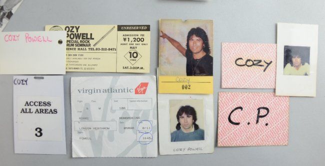Cozy Powell, a collection of artist passes, signed items, airline tickets all belonging to the former drummer of Black Sabbath, The Jeff Beck Group, Whitesnake & Rainbow, including a promotional card signed by Black Sabbath members Cozy Powell, Tony Martin & Neil Murray Provenance: Given to the current vendor by Frank Aiello (from Truth), best friend of Cozy Powell