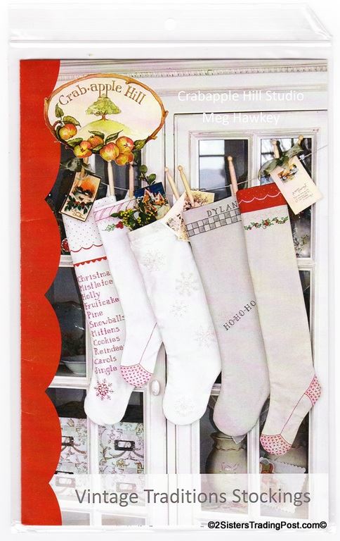 Pattern #427 'Vintage Traditions Stockings' Pattern includes directions for 2 size stockings and all the designs shown and more. 2011 design by Meg hawkey for Crabapple Hill Studio.