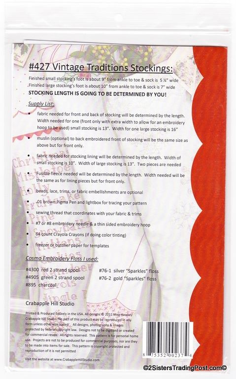 Pattern #427 'Vintage Traditions Stockings' Pattern includes directions for 2 size stockings and all the designs shown and more. 2011 design by Meg hawkey for Crabapple Hill Studio.