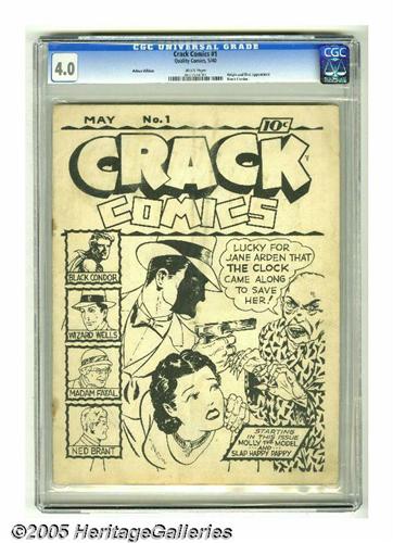 <B>Crack Comics #1 Ashcan Edition (Quality, 1940) CGC VG 4.0 White pages.</B></I> Ashcans are hand-produced comics made for purposes of securing a copyright, and by definition only a few copies at most exist of each, putting them among the rarest items the comic book collector can hope to acquire. This is the first time we've ever seen or heard of a <B>Crack Comics</B></I> ashcan, and the provenance of this one is impeccable, as it's from the collection of Gill Fox, who was an editor at Quality and also drew the covers of many of its comic books. The issue features the origin and first appearance of the Black Condor, with a story by Will Eisner and art by Lou Fine. There's also a slew of other attractions including Madame Fatal, who is a retired actor who fights crime disguised as an old lady! While the VG 4.0 Guide value for the regular comic is $940; this ashcan edition is not listed in Overstreet. CGC census 3/05 (for ashcan edition): 1 in 4.0, none higher. <I>From the collection of Gill Fox.</B></I>