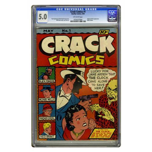 <B>Crack Comics #1 (Quality, 1941) CGC VG/FN 5.0 Off-white pages.</B></I> This debut issue features the origin and first appearance of the Black Condor, by artist supreme Lou Fine. Also appearing is the first Madam Fatal story, featuring the first cross-dressing superhero in comics. Bob Powell and Paul Gustavson contribute art, while Will Eisner provides stories. This respectable mid-grade copy still retains plenty of eye appeal. Overstreet 2005 VG 4.0 value = $940; FN 6.0 value = $1,410. CGC census 12/05: 1 in 5.0, 6 higher.