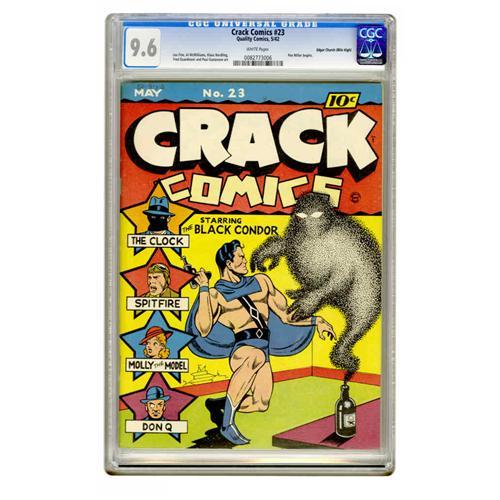 <B>Crack Comics #23 Mile High pedigree (Quality, 1942) CGC NM+ 9.6 White pages.</B></I> This sterling Edgar Church copy is alone at the top of CGC's census as of this writing! The comic stars the Black Condor, drawn by Lou Fine, and among the many backup features is the debut in this series of Pen Miller, formerly of <B>National Comics</B></I>. How's this for a premise: Pen is a "famous comic magazine cartoonist who is also an amateur detective of wide reputation!" Overstreet 2005 NM- 9.2 value = $860. CGC census 11/05: 1 in 9.6, none higher.