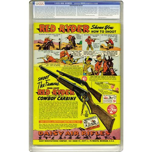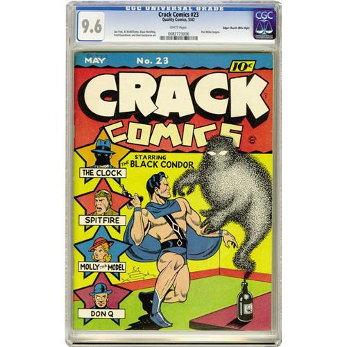 <B>Crack Comics #23 Mile High pedigree (Quality, 1942) CGC NM+ 9.6 White pages.</B></I> This sterling Edgar Church copy is alone at the top of CGC's census as of this writing! The comic stars the Black Condor, drawn by Lou Fine, and among the many backup features is the debut in this series of Pen Miller, formerly of <B>National Comics</B></I>. How's this for a premise: Pen is a "famous comic magazine cartoonist who is also an amateur detective of wide reputation!" Overstreet 2006 NM- 9.2 value = $885. CGC census 03/06: 1 in 9.6, none higher.
