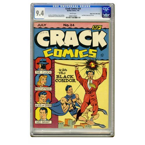 <B>Crack Comics #24 Mile High pedigree (Quality, 1942) CGC NM 9.4 White pages.</B></I> This issue marked the last of Lou Fine's great run drawing the Black Condor feature. Our offering, a beautiful Edgar Church copy in case you didn't notice, is only one graded above 5.0 that CGC has certified to date. Overstreet 2005 NM- 9.2 value = $860. CGC census 11/05: 1 in 9.4, none higher.