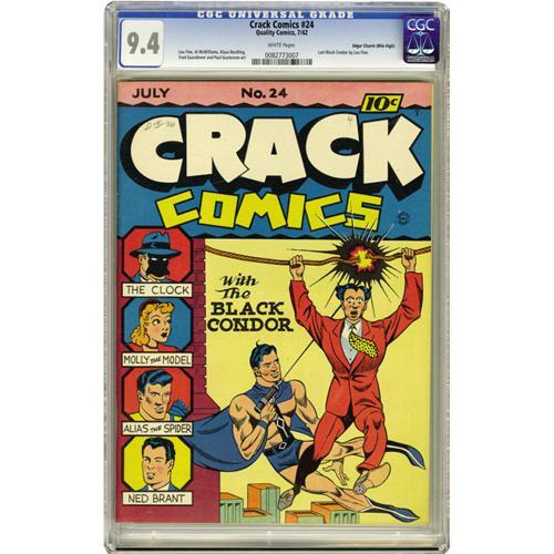 <B>Crack Comics #24 Mile High pedigree (Quality, 1942) CGC NM 9.4 White pages.</B></I> This issue marked the last of Lou Fine's great run drawing the Black Condor feature. Our offering, a beautiful Edgar Church copy in case you didn't notice, is only one graded above 5.0 that CGC has certified to date. Overstreet 2006 NM- 9.2 value = $885. CGC census 03/06: 1 in 9.4, none higher.
