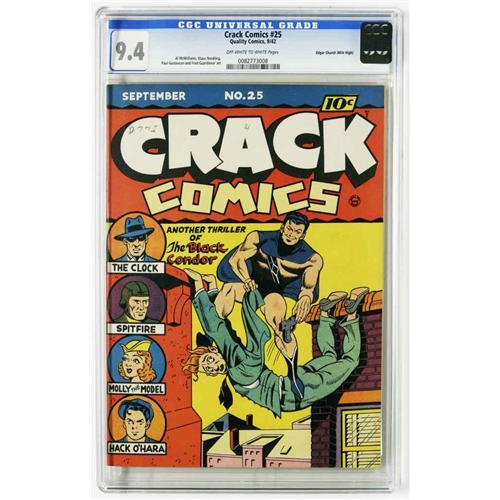 <B>Crack Comics #25 Mile High pedigree (Quality, 1942) CGC NM 9.4 Off-white to white pages.</B></I> The Black Condor, Quality Comics' high-flying hero, stars in this issue, which features a Gill Fox cover. John Cassone handles the Condor's adventures inside, while Jack Cole, Al McWilliams, Paul Gustavson, and Fred Guardineer all supply story art. This Edgar Church Mile High copy has all the attributes collectors come to expect from the pedigree -- blazing cover color and gloss, great paper quality, and the look of a book just placed on the stands! Overstreet 2005 NM- 9.2 value = $685. CGC census 11/05: 1 in 9.4, none higher.