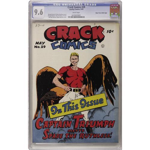 <B>Crack Comics #29 Mile High pedigree (Quality, 1943) CGC NM+ 9.6 White pages.</B></I> Captain Triumph, who had first appeared two issues previously, was a hero who could merge with the ghost of his dead twin brother, gaining super powers in the process -- making him the creepiest superhero <I>ever</B></I>. He's drawn on the cover by Ruben Moreira of later DC fame, and inside the issue by Alfred Andriola, who's best known for drawing the Kerry Drake strip. The back-up features include Jack Cole's Slap Happy Pappy. This is the highest graded copy certified by CGC to date. Overstreet 2006 NM- 9.2 value = $600. CGC census 10/06: 1 in 9.6, none higher.<BR><BR><b>Shipping:</b> Slabbed Comic (<a target="_blank" href="http://www.heritageauctions.com/common/shipping.php">view shipping information</a>)