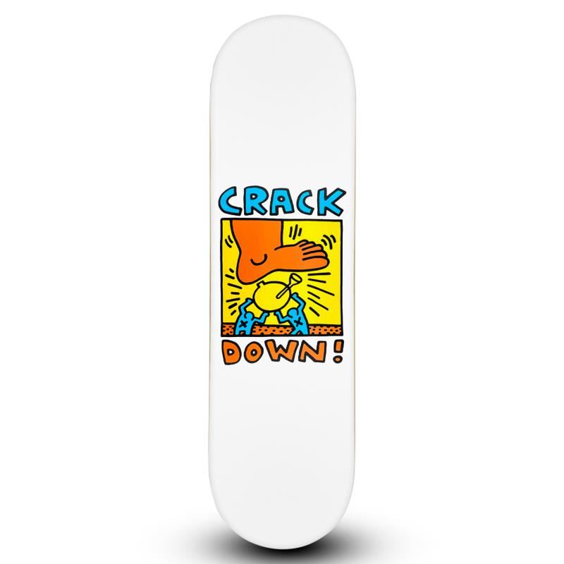 "Crack Down" is a skateboard by Keith Haring (1958-1990), bearing the plate signature of the artist inverso. Includes Letter of Authenticity. Measures approx. 32" x 8.5" (skateboard).