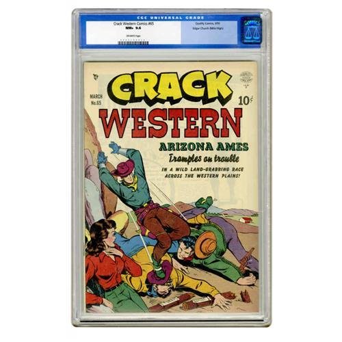 <B>Crack Western #65 Mile High pedigree (Quality, 1950) CGC NM+ 9.6 Off-white pages.</B></I> More than one superhero title was changed to a Western as readers' tastes changed, thus did <B>Crack Comics</B></I> become <B>Crack Western Comics</B></I>. Reed Crandall is among the artistic contributors to this issue. This Mile High copy is the only one CGC has certified to date, and it's safe to assume that no better copy exists of this white-cover issue. Overstreet 2005 NM- 9.2 value = $185. CGC census 12/05: 1 in 9.6, none higher.