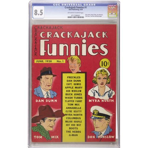 <B>Crackajack Funnies #1 (Dell, 1938) CGC VF+ 8.5 Off-white to white pages.</B></I> Dell Comics' original flagship title begins with this premiere issue, which was on the stands at the same time as <B>Action Comics</B></I> #1. Strip favorites like Don Winslow, Tom Mix, Wash Tubbs, and more fill its 64 pages. This attractive example has been very well kept, and has the look of a pedigreed copy. Overstreet 2006 VF 8.0 value = $1,575; VF/NM 9.0 value = $2,488. CGC census 10/06: 1 in 8.5, 4 higher.<BR><BR><b>Shipping:</b> Slabbed Comic (<a target="_blank" href="http://www.heritageauctions.com/common/shipping.php">view shipping information</a>)