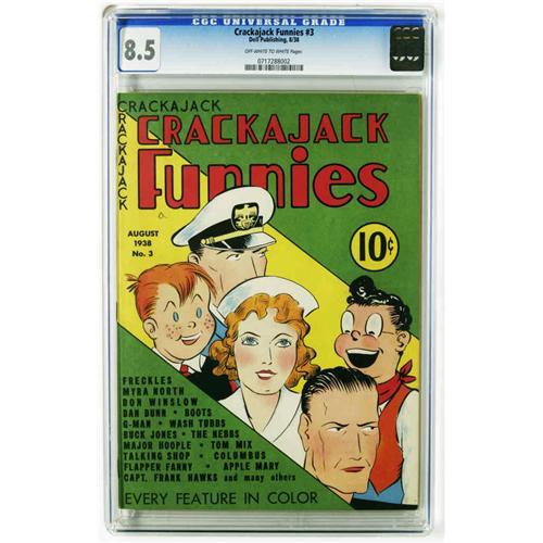 <B>Crackajack Funnies #3 (Dell, 1938) CGC VF+ 8.5 Off-white to white pages.</B></I> This one's in darn fine condition for an early Golden Age book. Don Winslow of the Navy and Tom Mix head up the cast of characters. Overstreet 2005 VF 8.0 value = $444; VF/NM 9.0 value = $685. CGC census 12/05: 1 in 8.5, 1 higher.