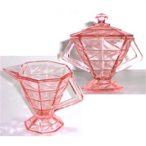 Indiana Glass produced this beautiful Art Deco pink Cracked Ice sugar bowl, with lid, and creamer set, circa 1930. Shown on page 195 in Hazel Marie Weatherman: Colored Glassware of the Depression Era vol 2. Very rare to find this set complete with its lid and with all three pieces in excellent condition.