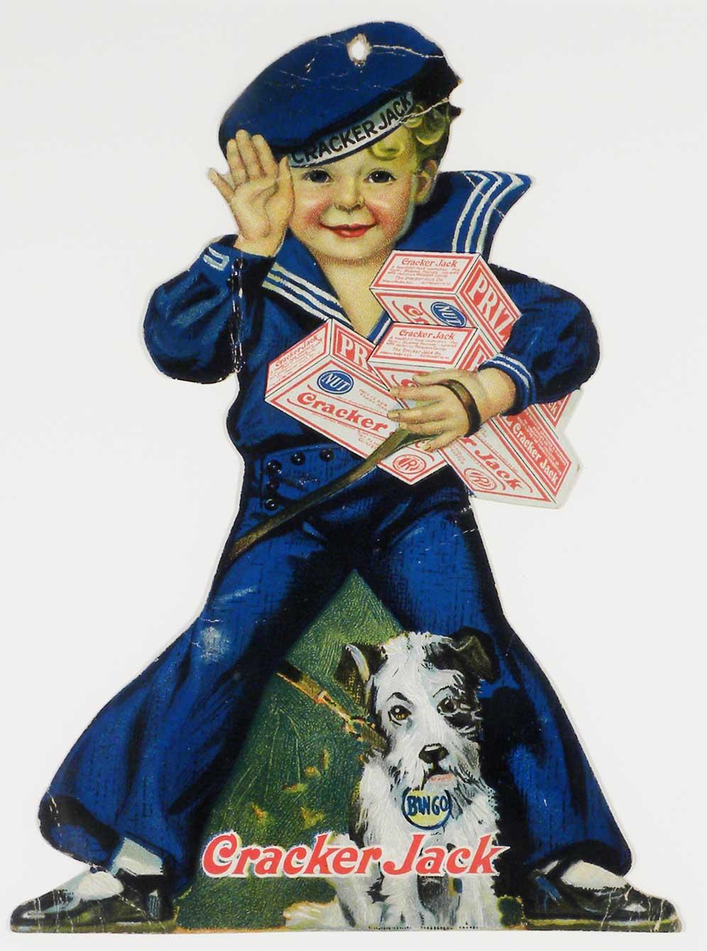 Cracker Jack Boy and Dog Bingo Die Cut Cardboard Sign. Framed under glass. Dog ears and creases otherwise good condition. 7 1/2 X 10 1/4 inches.