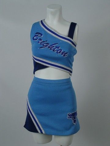 From the "rich people are crazy" TV Series, "Cracking Up", this is Chloe Shackleton's (Caitlin Wachs) screen used cheerleader uniform. Light blue with dark blue, white, and silver trim cheer uniform top with "Brighton" across the front, and matching cheer uniform skirt. Also has light blue pair of spankies. "Chloe" is written inside the top and skirt.