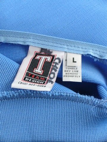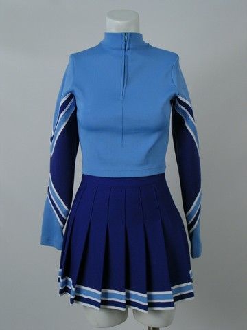 When Ben (Jason Schwartzman), a simple boy from a simple town , moves into a guest house in Beverly Hills, he sees a world gone mad! That is the premise of the TV series "Cracking Up" (2004). This is star Chloe Shackleton's ( Caitlin Wachs) cheerleader uniform. It is light blue zip front turtle neck top and matching cheer uniform skirt. Also includes dark blue pair of spankies. "Chloe" is written on the inside tag of all three pieces.