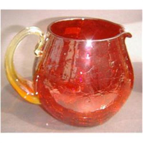 Crackle Glass Large bulbous pitcher in red/orange. Hand blown with pontil scar. Blenko Glass Company. Hand applied handle. No damage. 6"" tall and 5 3/4"" across at its widest.