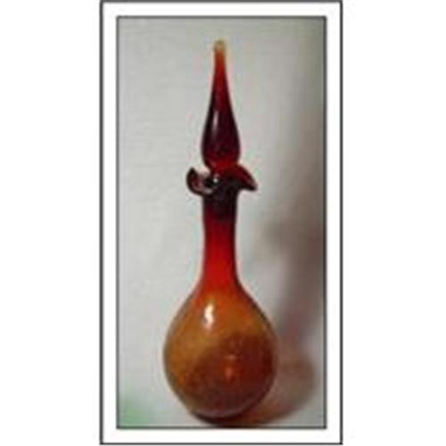 Crackle Glass decanter in amberina. quad-fold top. Hand made. 13 1/2"" to the top of the stopper. No damage.