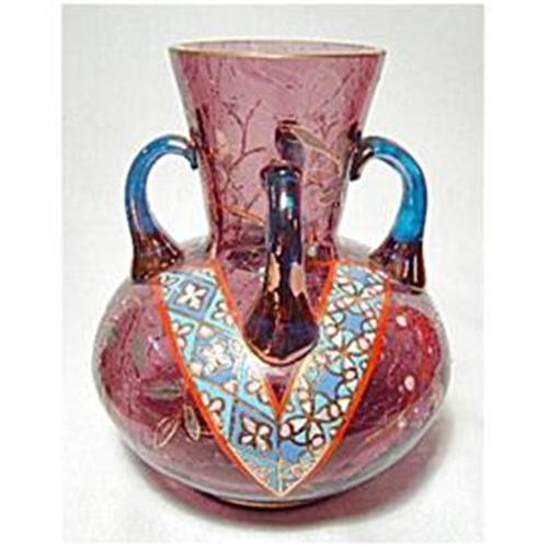 Crackle Glass four-handle vase most likely made by Auguste Jean. Breathtaking amethyst base color with polychrome designs and enamel stippling. The four handles are overlay with gold with some slight wearing. When held up to light, the handles are cobalt under the gold. The top rim is fire polished smooth and is overlay with gold. There is no damage to this vase. It measures 6" tall and its bulbous body is 5". For accurate posting, two or three of the enamel stipples are worn, but does not detract from the beauty of this vase. RARE FIND.
