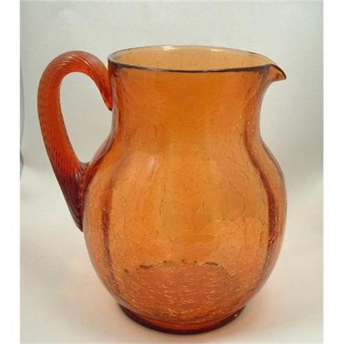 Crackle Glass Lemonade pitcher in Topaz colored. The pitcher 8 1/4" tall and 5"" across at the top, has a Victorian reeded hand applied matching handle. Extremely fine sparkling crackle. There is no damage to the pitcher.