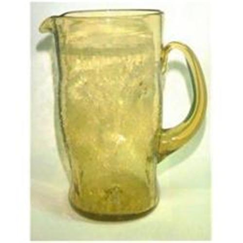 Large crackle glass pitcher that is pinched in. Amber colored. Hand blown with amber colored hand applied handle. No damage. 8 1/4"" tall and 5"" across at the top. Pitcher has nice weight to it.