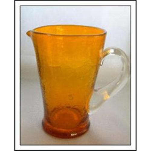 Crackle Glass Pitcher in honey amber. Very utiliarian pitcher. All hand blown. Hand applied crystal handle. Sharp pontil mark. No damage. There is a piece of stone embedded in the glass. This is done when the piece is made. Glass factories used fans to cool down the area and sometimes blew up bits of stone which accidentally get embedded into the glass. Makes it unusual and something different. 6"" tall. 4"" across at the top.