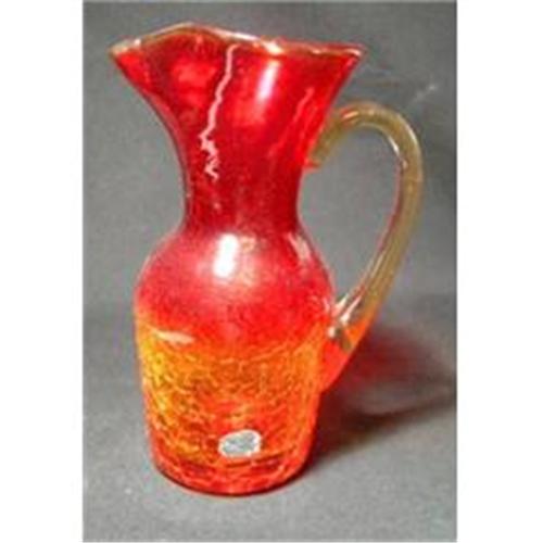 Crackle Glass Rainbow Pitcher which still has the original label still attached. The pitcher is 7"" tall and the color is amberina. Absolutely a gorgeous piece. Hand blown with pontil scar. No damage.