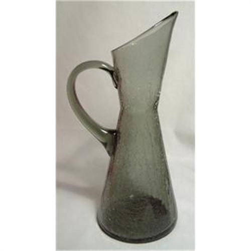 Crackle Glass pitcher in extremely rare smoke grey. As far as colors go with crackle glass, cobalt is probably the rarest and smoke grey is right behind it. The pitcher is a large one, measuring 12 1/2" to the top. It is all hand blown. The maker is Pilgrim Glass Company, who went out of business several years ago. So, this is doubly rare: color and maker. The crackling is very small and fine and when the sunlight hits it, better have your sunglasses on. Large hand applied handle for easy handling and pouring. No damage.