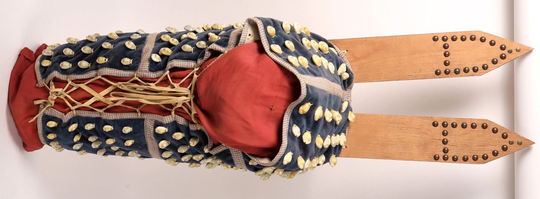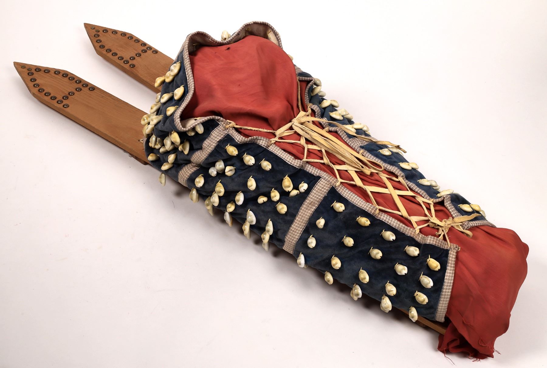 Wooden cradle board from a Great Plains tribe made with a simple frame of four pieces of sawn lumber stitched together with 3mm, multi-ply cotton rope and native-tanned leather ties. The top ends of the frame are decorated with 3/8-inch brass upholstery tack in a tall A pattern with two flat-head tacks at the apex of each A. Commercial cloth wrapping is made from an outer layer of blue velveteen and a patterned cotton cloth, all pieced together with machine stitching. It is lined with a light cotton canvas material. The outer surface is covered with 184 3/4-inch cowrie shells arranged in rows of 5 to 7 shells individually held on with cotton thread. Cowrie shells came to the Great Plains tribes as a substitute for traditionally carved elk teeth. These and dentallium shells, metal coins, and large Crow glass beads are symbols of status among the Tribes. This cradle board has been lightly used and is in very good condition. Approx. 37 x 10 x 9 inches. See photos for design details. Thanks to Norm DeLorme for description details.