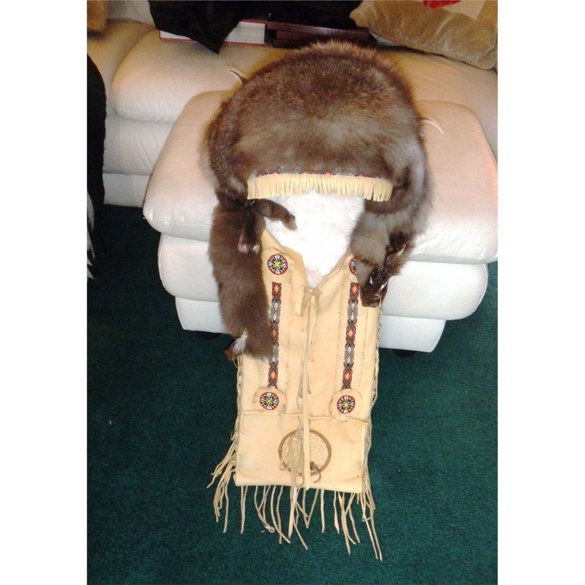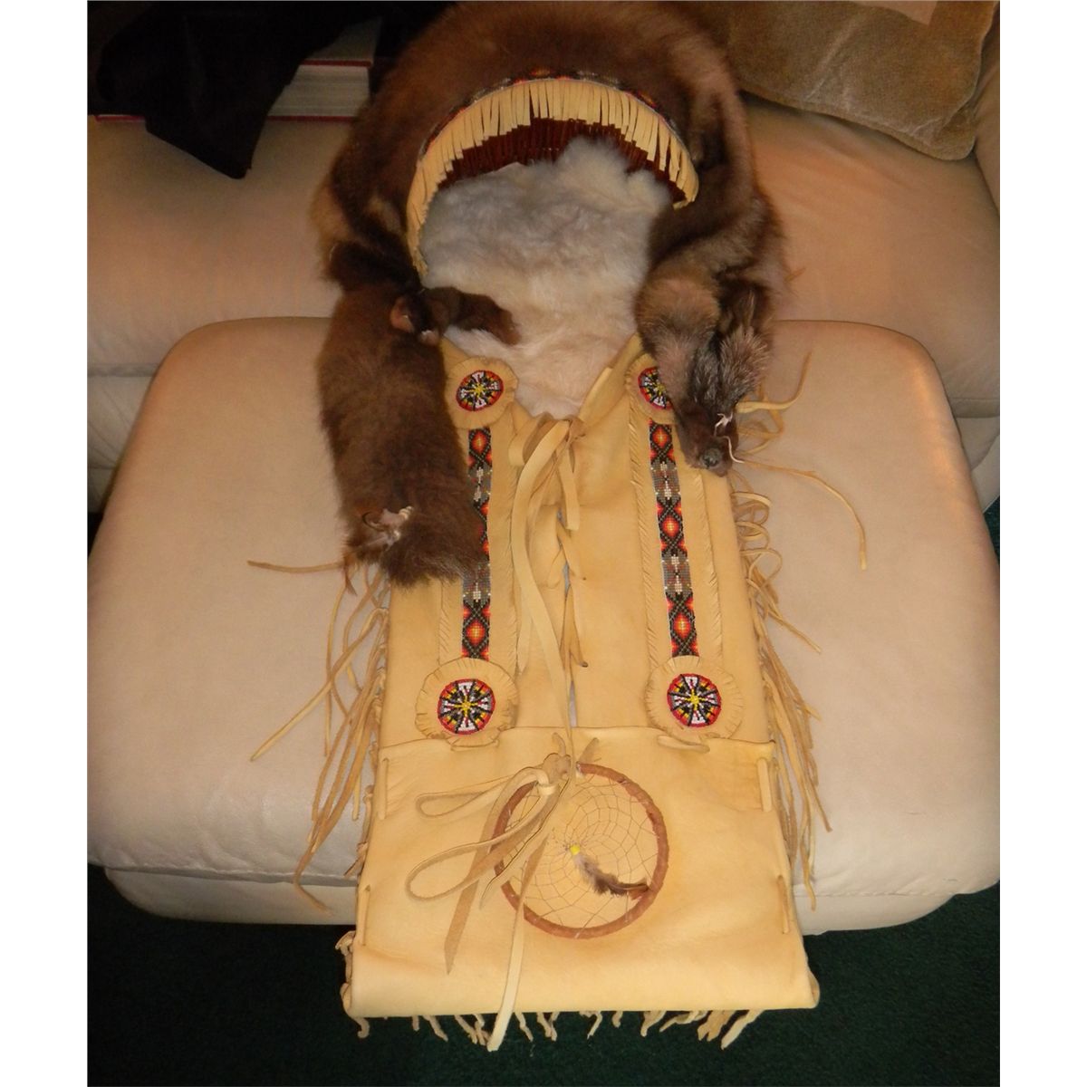 Cradle Board With Faux Fur Leather covered with beads fringe, feathers and fur. Size 32"x14"x8" - Shipping $25.00
