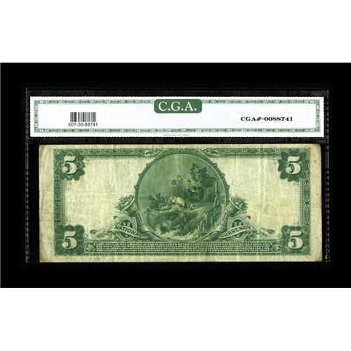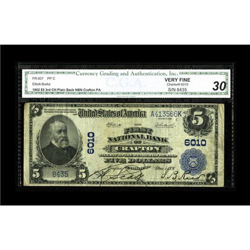 <B>Crafton, PA</B></I> - $5 1902 Plain Back Fr. 607 <B>The First NB</B></I> Ch. # 6010<BR>This issuer left just $1,970 of its Large Size in public hands when it closed in 1934. The note we offer tonight is certified as <B>CGA Very Fine 30</B></I>.<BR><BR><b>Shipping:</b> Coin/Currency (<a target="_blank" href="http://www.heritageauctions.com/common/shipping.php">view shipping information</a>)