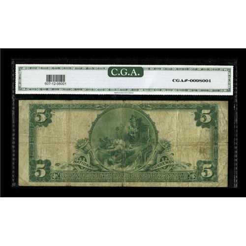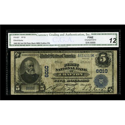 <B>Crafton, PA</B></I> - $5 1902 Plain Back Fr. 607 <B>The First NB</B></I> Ch. # 6010<BR>This solid serial number 8 issue displays boldly printed signatures. The paper is pleasing though there are some breaks in the paper on the center fold in the margins. <B>CGA Fine 12.</B></I><BR><BR><b>Shipping:</b> Coins & Currency (<a target="_blank" href="http://www.heritageauctions.com/common/shipping.php">view shipping information</a>)