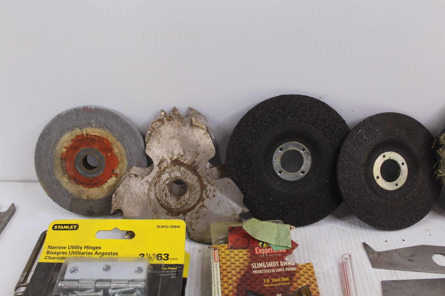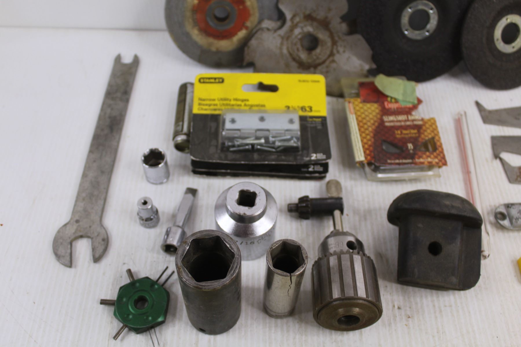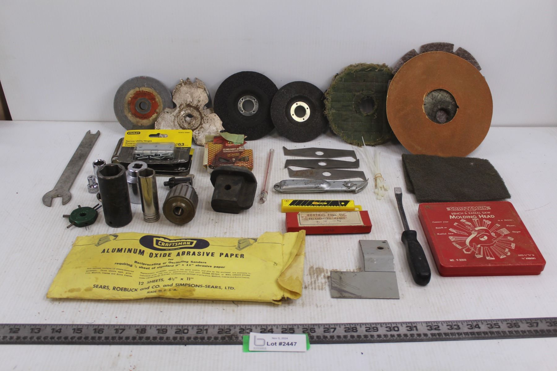 Craftsman Bench & Radial Saw Molding Head, Assorted Sanding Disks, Assorted Saw Blades, Abrasive Paper, Assorted Sockets, (3) Stanley Utility Hinges, Misc.